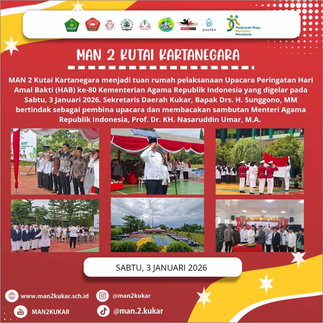 Kukar (Madrasah) — MAN 2 Kutai Kartanegara menjadi tuan rumah pelaksanaan Upacara Peringatan Hari Amal Bakti (HAB) ke-80 Kementerian Agama Republik Indonesia yang digelar pada Sabtu, 3 Januari 2026. Apel berlangsung tertib dan khidmat di halaman madrasah dengan mengusung tema