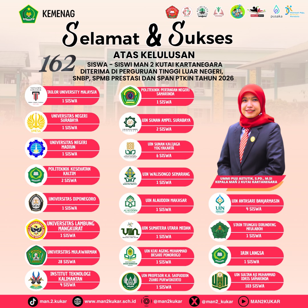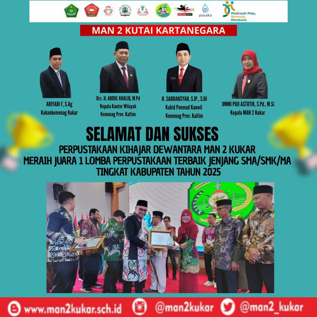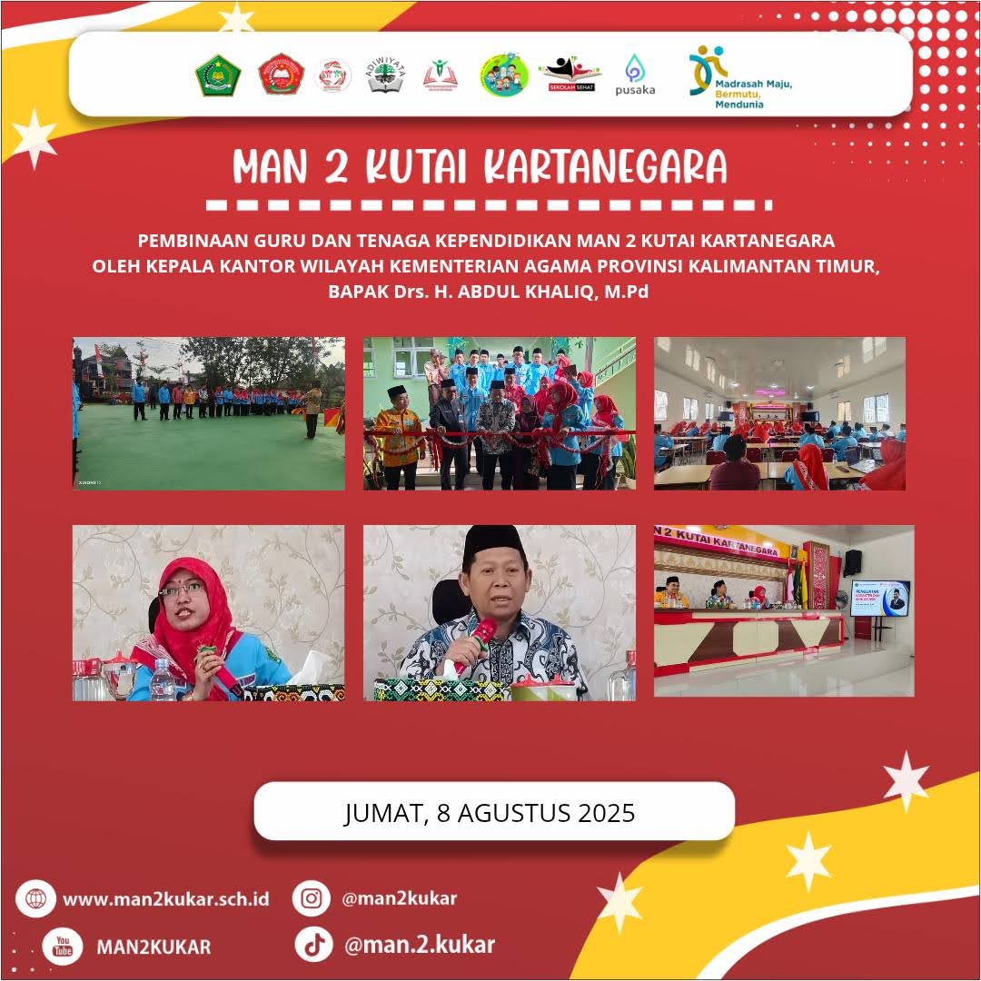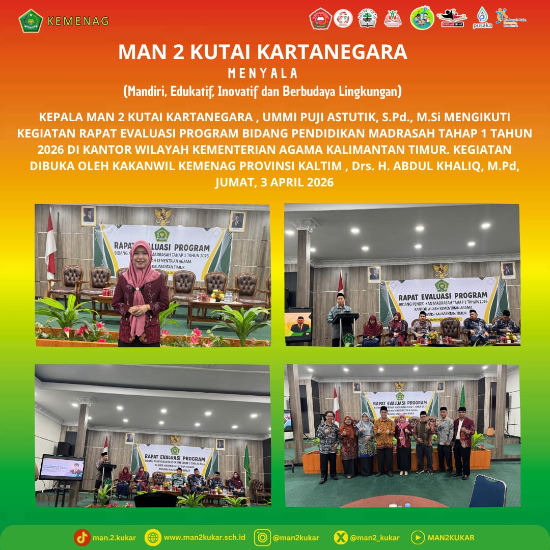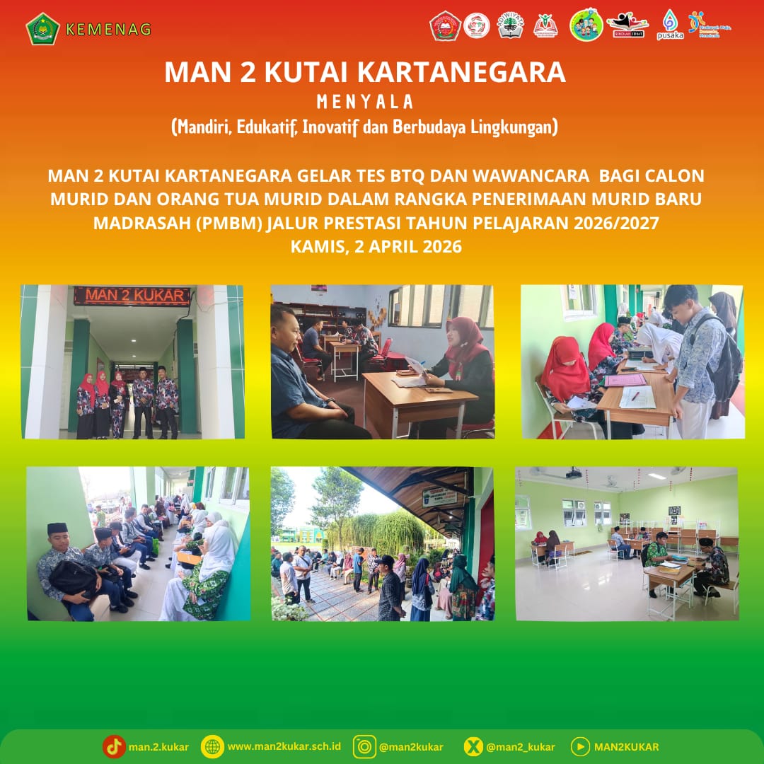 Assalamualaikum Wr Wb…. BissmillahirrahmanirrahiimWelcome to MAN 2 KUKAR…Selamat datang di dunia pendidikan MAN 2 KUKAR. Kami merasa sangat bangga mendapatkan perhatian dan kepercayaan dari Bapak-Ibu sekalian. Kami akan berupaya untuk dapat menjalankan amanah ini dengan baik agar pertanggung jawaban di hadapan Allah SWT kelak menjadi ringan.Di sini kami mengajak anda para orang tua siswa untuk berpartisipasi membangun masyarakat pembelajar dalam rangka menyongsong era baru bagi...