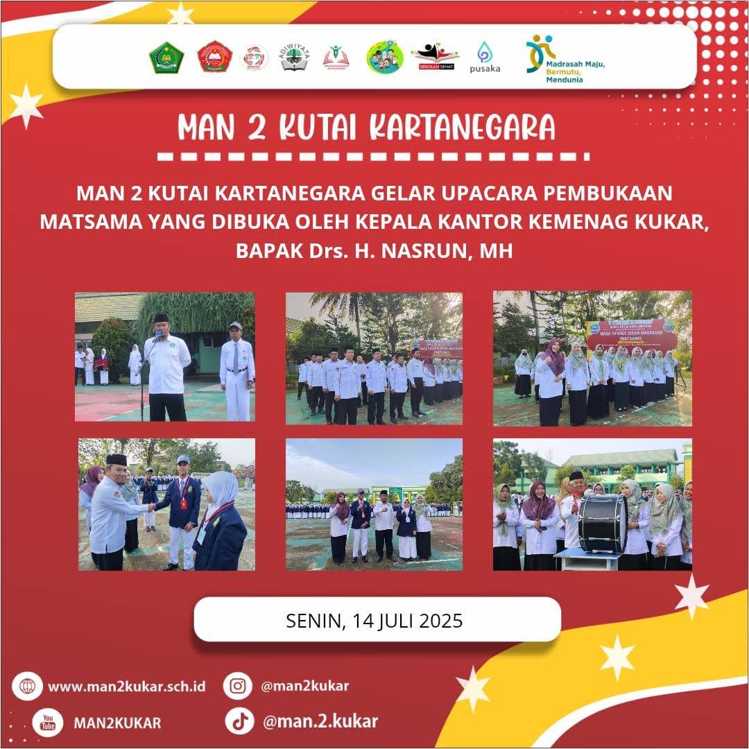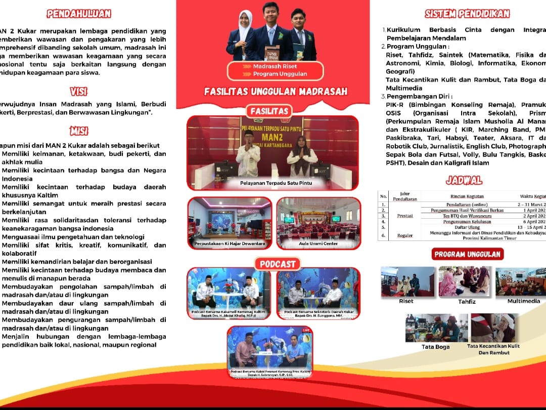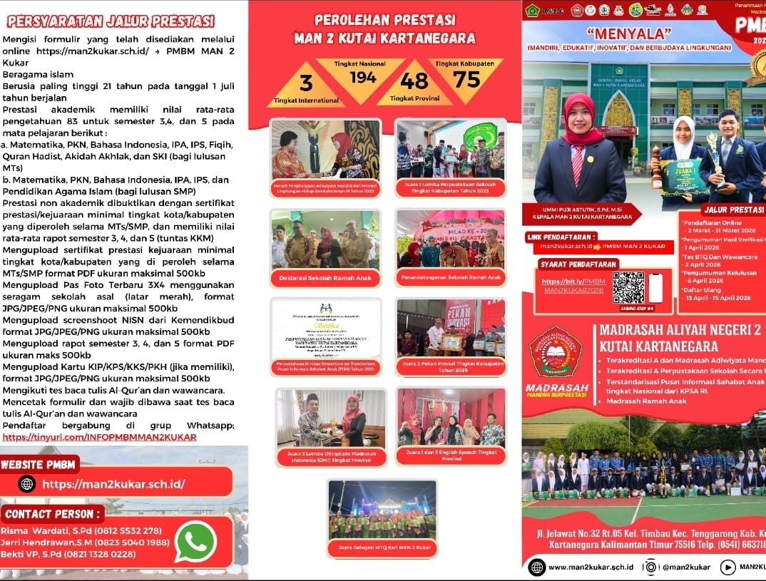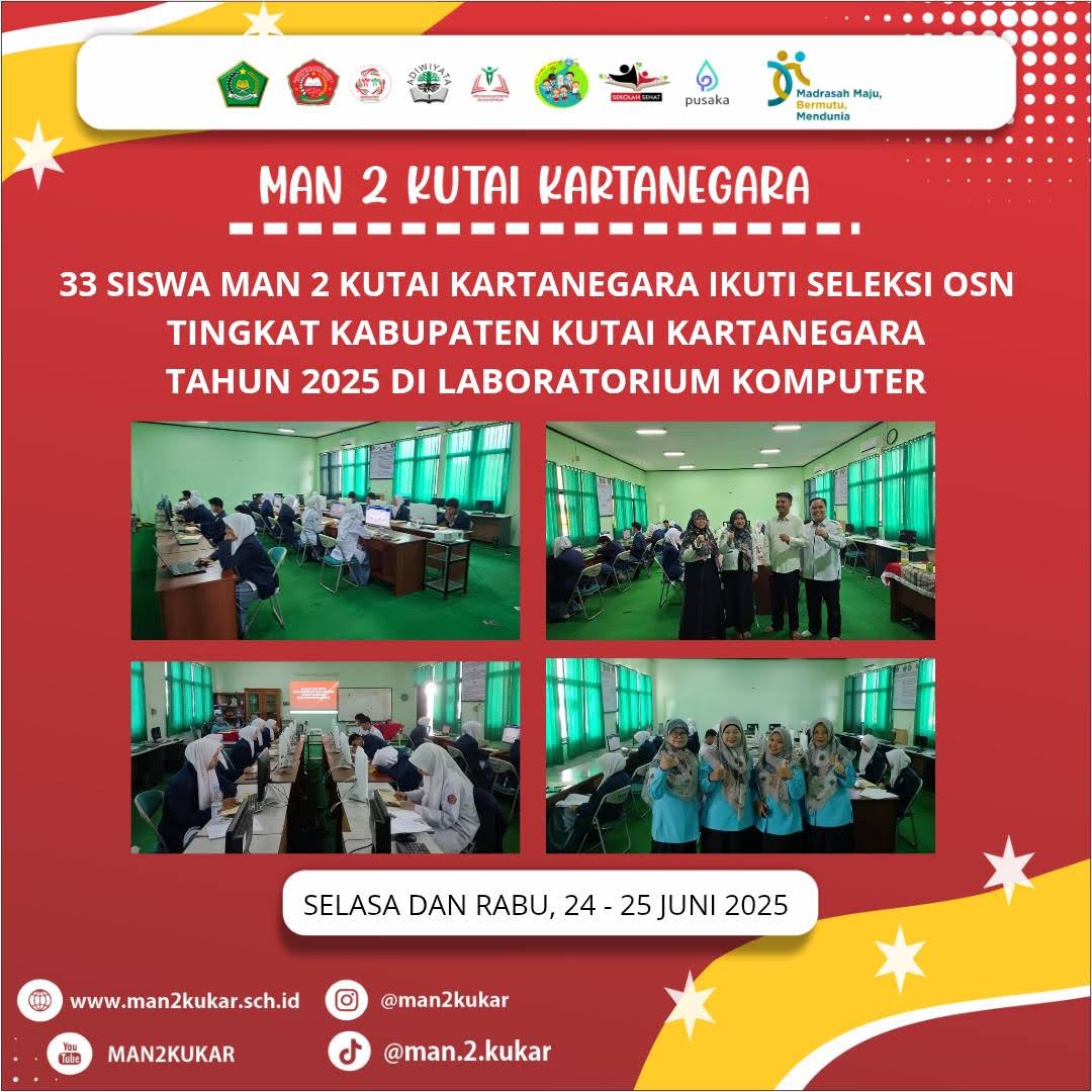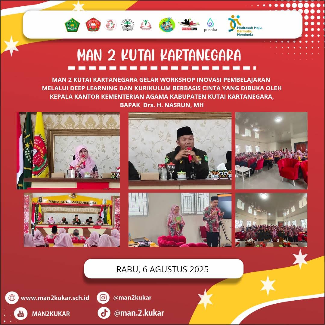 Assalamualaikum Wr Wb…. BissmillahirrahmanirrahiimWelcome to MAN 2 KUKAR…Selamat datang di dunia pendidikan MAN 2 KUKAR. Kami merasa sangat bangga mendapatkan perhatian dan kepercayaan dari Bapak-Ibu sekalian. Kami akan berupaya untuk dapat menjalankan amanah ini dengan baik agar pertanggung jawaban di hadapan Allah SWT kelak menjadi ringan.Di sini kami mengajak anda para orang tua siswa untuk berpartisipasi membangun masyarakat pembelajar dalam rangka menyongsong era baru bagi...