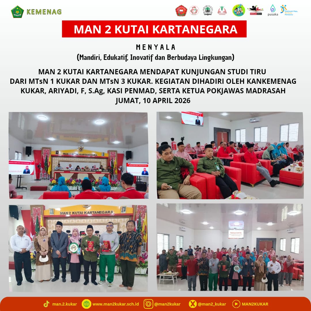 Kukar (Madrasah) - Madrasah Aliyah Negeri (MAN) 2 Kutai Kartanegara menerima kunjungan studi tiru dari Madrasah Tsanawiyah Negeri (MTsN) 1 Kukar dan Madrasah Tsanawiyah Negeri (MTsN) 3 Kukar. Kegiatan ini dilaksanakan dalam rangka berbagi praktik baik serta memperkuat sinergi antar madrasah di